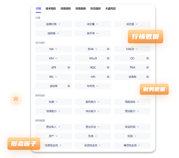 支持全行情數(shù)據(jù)、財(cái)務(wù)數(shù)據(jù)、形態(tài)因子等多因子;